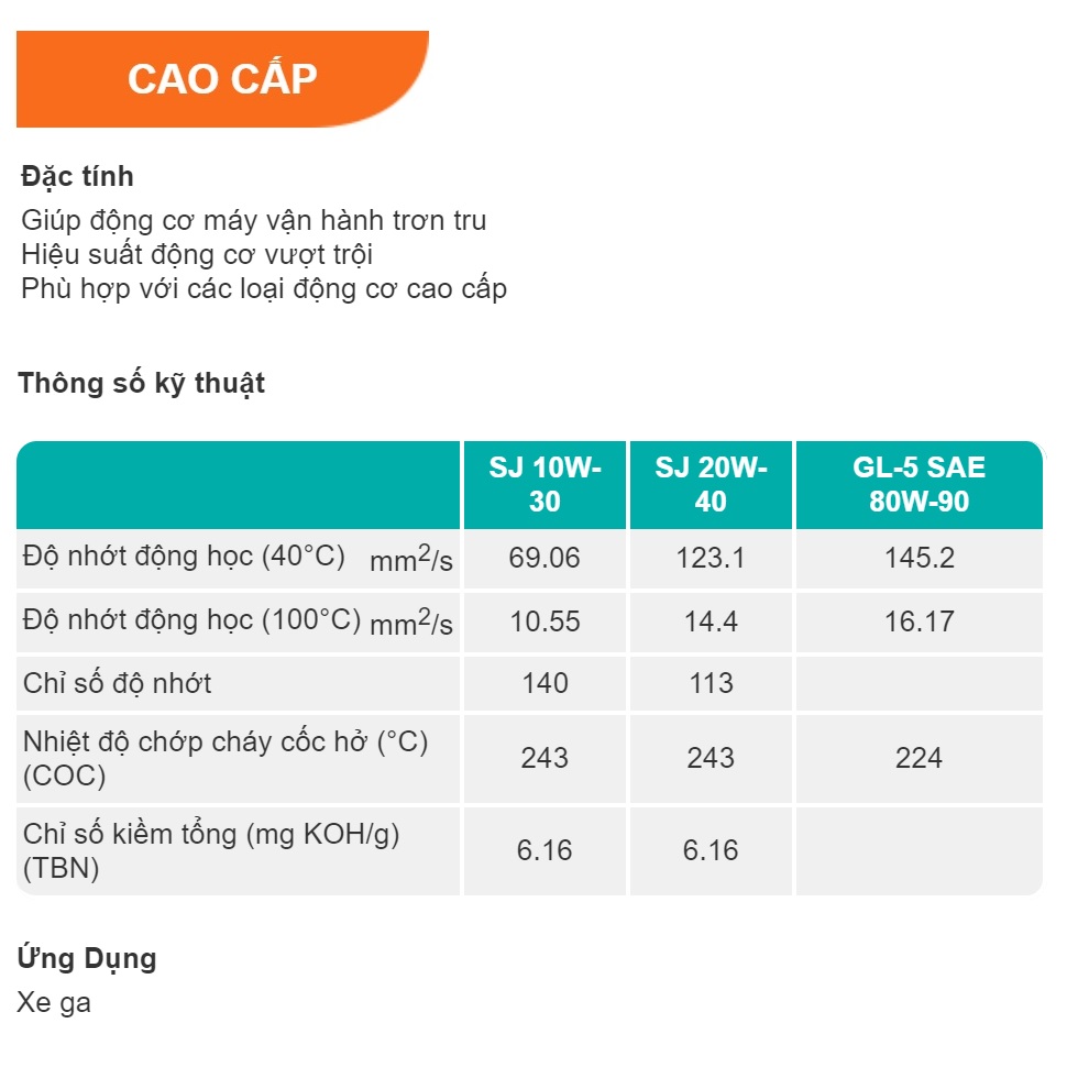 Tiêu chuẩn kỹ thuật: API SJ, SAE 10W30/MB